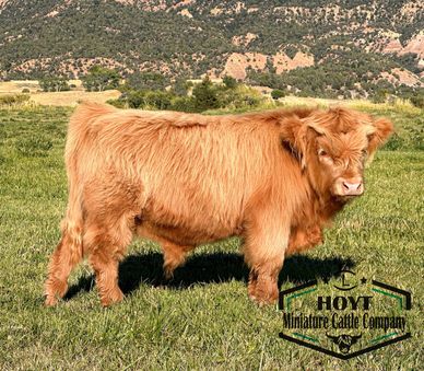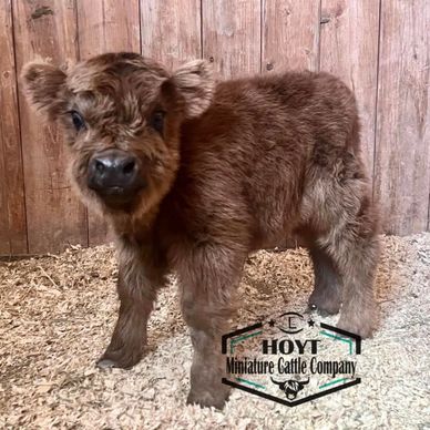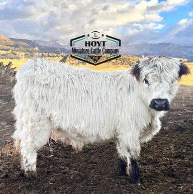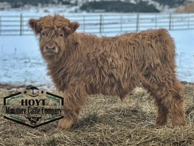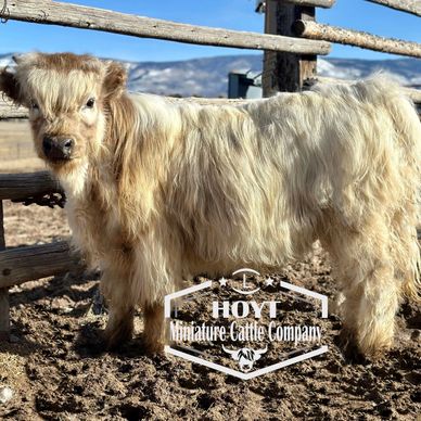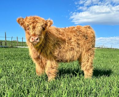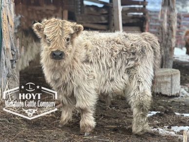 HMC Fergie, a miniature yellow highland, gave us this adorable little guy on 11/2/23. He is sired by an outside small midsize white highland bull. He is such a character and has phenomenal hair!
